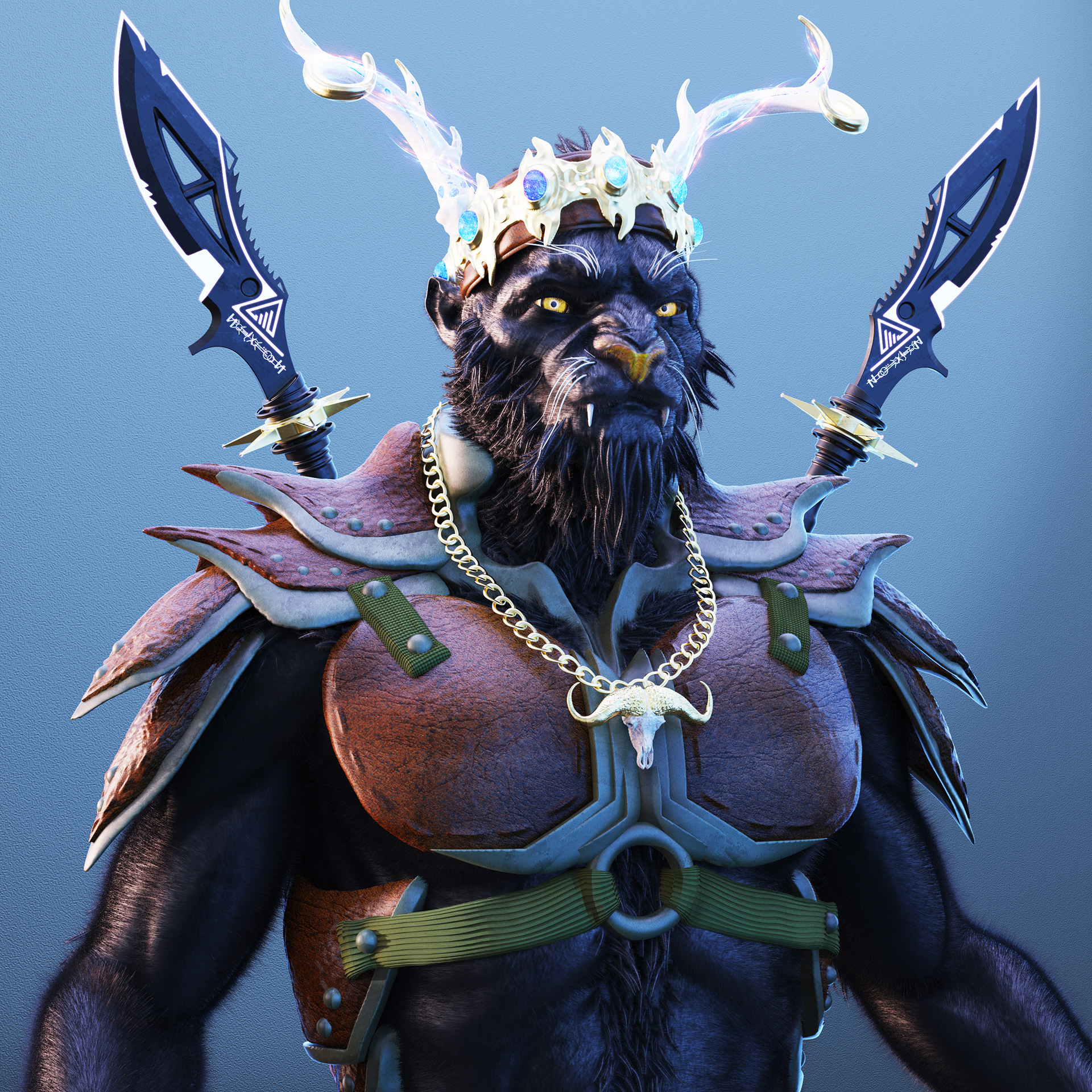 The Tivali Explorer (as seen below) were originally going to fill 333 NFT's in the collection. To accomplish this number with all unique images, there are 7 different background colors, 4 different body colors, and 14 different traits for the Explorer class. This allows for multiple combinations of colors and traits for the final images. This was more than just a design project. It was extremely challenging to figure out how to create the image combination system and make sure it all looked amazing in the end. The fur for the Tivali made everything very tricky. Having the necklace's and armor overlap with the fur made the image combination part of the project extremely difficult. This was hands down one of the hardest projects I have ever created.