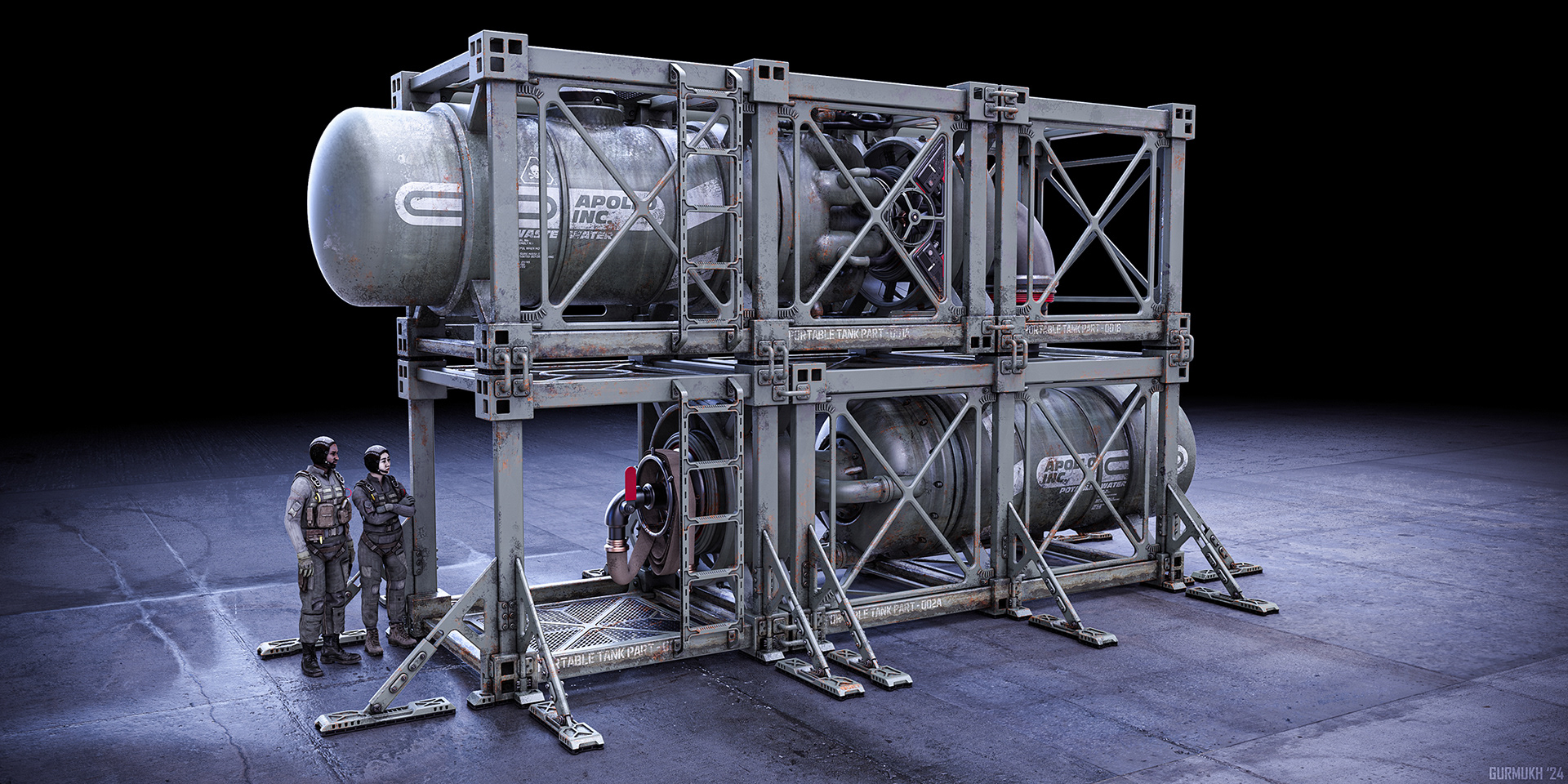 For this project, I picked something random to design to see what I could come up with. Liquid tanks have a fun shape to play with, so I came up with the idea to design a portable water filter that breaks down into parts and can easily be transported and quickly assembled out in the field. These pieces fit on the back of 3 cargo trucks. The idea is to pump any kind of polluted water into the top tank and filter it down into the bottom tank as drinkable water.